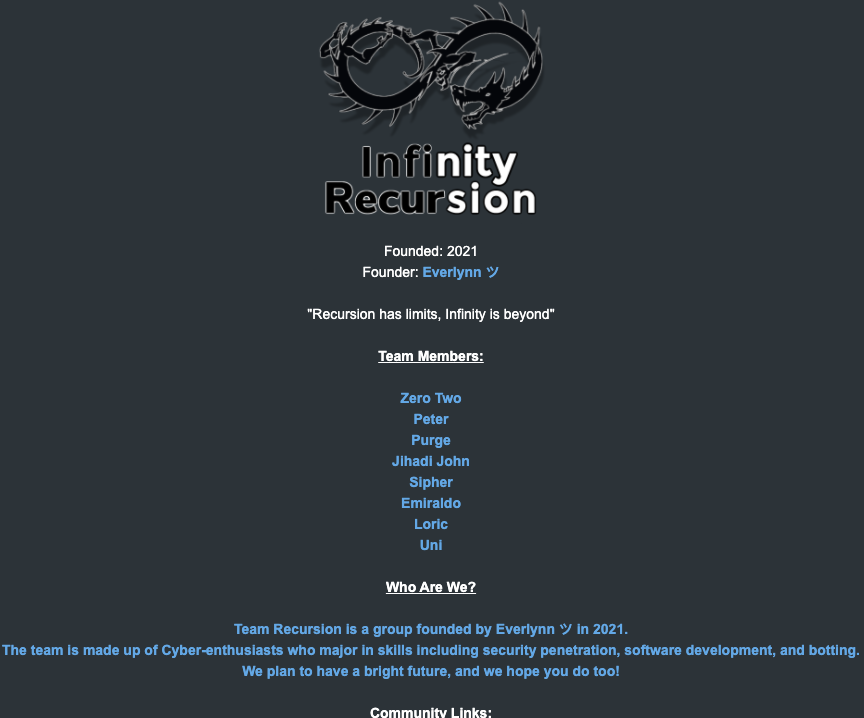 The roster of the now-defunct “Infinity Recursion” hacking team, which sold fake EDRs between 2021 and 2022. The founder “Everlynn” has been tied to Jubair. The member listed as “Peter” became the leader of LAPSUS$ who would later post Jubair’s name, phone number and hacker handles into LAPSUS$’s chat channel.